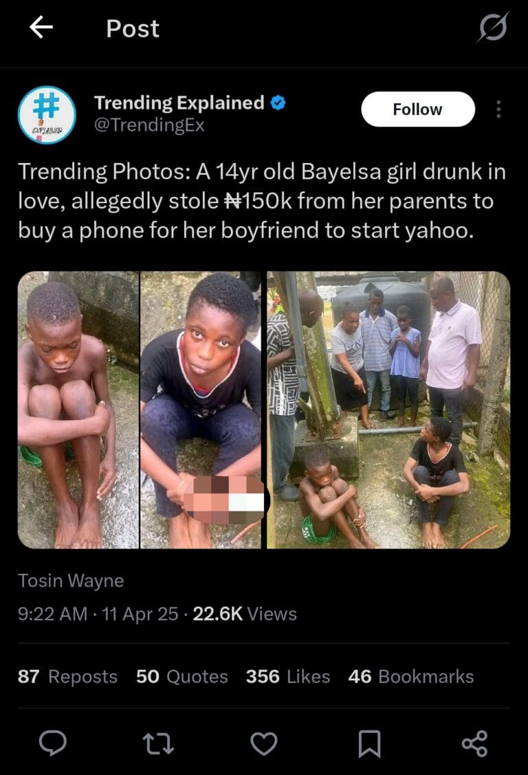 A lady in Bayelsa has allegedly stolen ₦150,000 from her parents to buy a new phone for her younger boyfriend, reportedly to help him start internet fraud, commonly known as “Yahoo.”